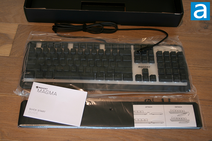 Out of the box, we get the ROCCAT Magma wrapped inside a white translucent plastic bag. Another bag can be found holding the included ROCCAT wrist rest. A plastic USB Type-A cable can be seen attached to the keyboard itself. ROCCAT also provided a user manual that did not come inside any bag. Nothing else came out of the box, so let us move on to the visual inspection.