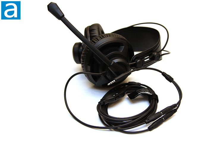 Back to the full view, here is the ROCCAT Renga Boost with the microphone rotated into position. The microphone is coated in rubber and can be easily bent into shape. A 2.5m cable is permanently attached with an integrated in-line remote that has a microphone on/off switch and a resistor-based volume control slider. The cable is rubber coated with two 3.5mm gold plated straight-plug stereo jacks, one for the microphone and one for the headphones; both with color coded poles and comes with a microphone or headphone logo on the plugs. An adapter is included to convert the pair of 3.5mm stereo jacks into a single 3.5mm three-pole jack. The cable is fairly tangle resistant thanks to its thickness and is reasonably resistant to microphonics, which is always a good thing.