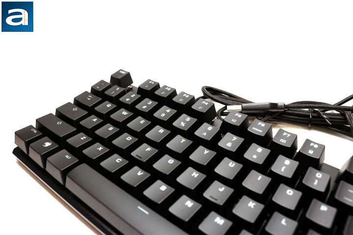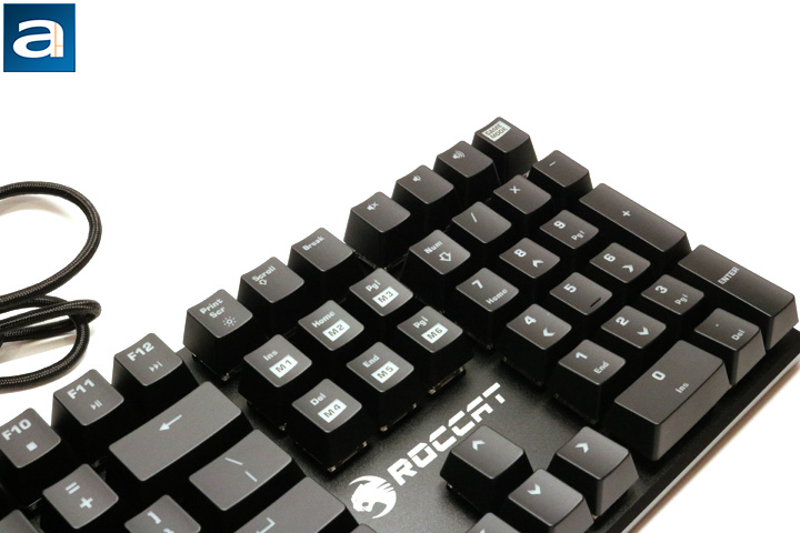 I do appreciate the frameless design ROCCAT opted for in this keyboard, especially with the aluminum plate on top. Because of the aluminum plate, there is very little flex to the keyboard, which demonstrates its great build quality. The aluminum also gives it more than just a strong build, but a sense of class with its clean appearance. This point is further emphasized with rounded edges on all sides. ROCCAT definitely did not try to cut any corners when it comes to its construction. The rest of the keyboard housing is made out of plastic, but this does not take away from the overall build quality and feel of the Suora FX. The keyboard is entirely black, with only the ROCCAT name and symbols above the arrow keys in white. The top side, which is not shown in the picture above, has the keyboard's name, as well as some main features. It seems a tad odd it would have to advertise on the product itself, but otherwise the keyboard is clean.