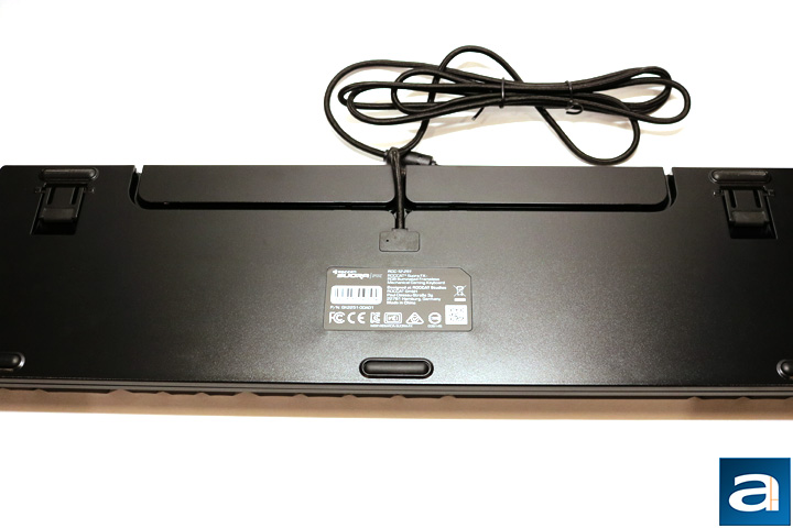 There is nothing too special about the back of the ROCCAT Suora FX. As usual, there are four rubber feet located at each corner of the keyboard, but adds one located in the center bottom position. They are elongated ovals in shape, and should give enough traction on most surfaces for the keyboard to stay in place during intense gaming sessions. In addition to the five rubber feet, the top two corners also have feet that stand for a better typing angle. On each of these, there is some rubber here to provide more traction. In the middle of the keyboard is a sticker providing information regarding its design. Another helpful addition on this side are the tracks for the cable. There is a center track and a track leading to both the left and right sides of the keyboard. This is useful for anyone who values cable management on their desk.