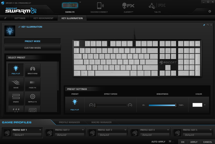 The software for the ROCCAT Suora FX was easy enough to find and use. Everything was laid out clearly, and the instructions were plain and simple. One minor annoyance is after downloading the software, I had to go through a couple of updates until the Suora FX was recognized. This is due to the ROCCAT Swarm software being used for more than just this keyboard. The first page of the software is for basic settings, such as character repeat rate and key reaction time. A small but fun feature to play with is sounds for each key press. There are a couple of sounds to play around with, but I cannot really see anyone implementing them for daily use, and they are more so here just for fun. The key assignment tab is mostly for recording macros. A nice feature with the software is the Macro Manager, which contains a list of games that has some preset macros for each game listed for you to implement. I looked at the macros for DOTA 2 and Counter-Strike: Global Offensive, the games I am most familiar with, and most of the macros are fairly basic, but still quite useful. The final tab is key illumination. On this page, all the information and lighting styles are shown, and there is a custom mode to illuminate only certain areas of the keyboard with separate colors, which can be quite useful for different hotkeys in games. Unfortunately, even though this keyboard is RGB, there is no color picker to choose from. Instead, there are only seven colors available to choose from for all the lighting effects. On the bottom of each of the pages are the different profiles for the ROCCAT Suora FX, which can have up to five different profiles. The software overall is simple and intuitive, but there is a noticeable delay between switching through the different tabs or settings. It can be a little slow at times, but overall this does not really impede the use.