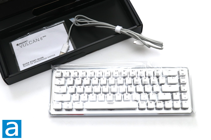 Out of the box, the ROCCAT Vulcan II Mini can be found in a clear plastic bag to prevent scratches in transport, while the edges are lined with clear tape to prevent further surface scratches on the reflective portions. A matching grey and white USB Type-C to full-sized USB braided cable can be found and collected by a white Velcro strap. A quick start guide is found at the bottom to help users plug in their keyboard and find the different shortcuts available with the Vulcan II Mini. Otherwise, there is not much else to look at, so let us dig deeper to the ROCCAT Vulcan II Mini.