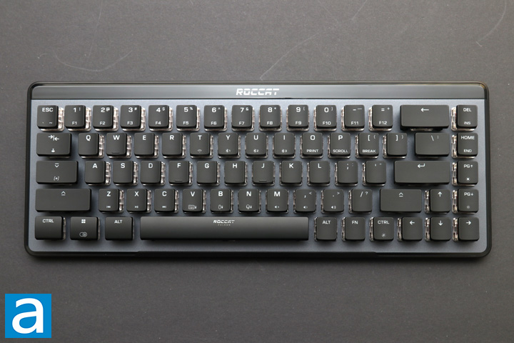 The ROCCAT Vulcan II Mini Air is not the first 65% keyboard we have looked at, nor is it the first 65% ROCCAT keyboard either, as that crown goes to the Vulcan II Mini. As such, there are familiar elements between the two keyboards. For one, we have a similar shape and style with its beveled edges around the perimeter of the keyboard. Its island-style, short keycaps expose the switches underneath, which is consistent across all ROCCAT Vulcan series keyboards. This Vulcan II Mini Air has a dark gray and black finish. One thing that is different is the glossy black bar at the top with ROCCAT's branding in the middle. This brand name is translucent to allow lighting to shine through, as you will see later on. All plastic parts, such as the bottom shell of the keyboard and the keycaps, are black in color. This is a slight contrast from the exposed gray aluminum backplate. Otherwise, this is a pretty compact keyboard altogether.