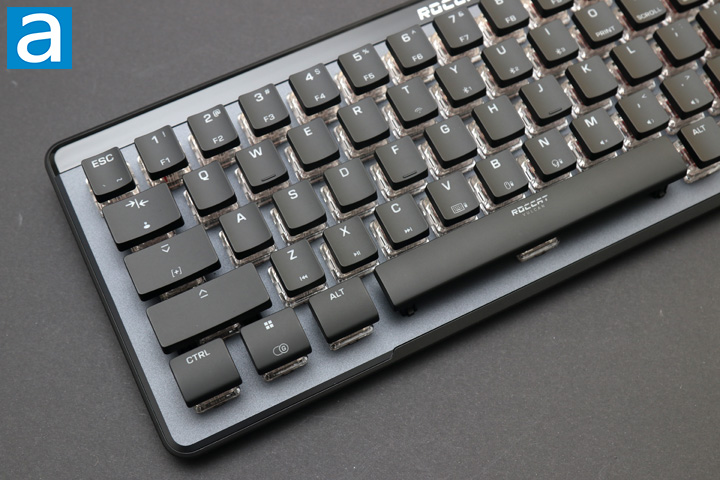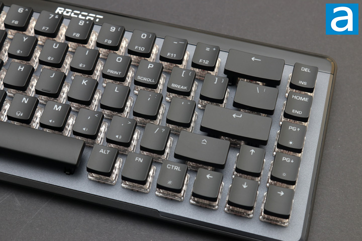 The keycaps on the ROCCAT Vulcan II Mini Air are made out of ABS, or acrylonitrile butadiene styrene, plastic. I prefer PBT keycaps over ABS, as they are harder, keep their color better, and do not shine or look greasy after prolonged use. ABS keycaps are definitely more economical still. The Vulcan II Mini Air keycaps are not OEM profile, as they feature more of a staircase-like stepping down from row to row. From a side view, the keycaps look flat, but each key, minus the longer ones, are curved inward in the middle so that users' fingers rest easier in this slight valley. The keycaps are laser-engraved, which means the keycap is painted over in an opaque color and the legends are etched out with laser. These will potentially fade or wear out over time. Finally, the font on the keys is pretty clear without necessarily looking too gamer-centric. The keycaps use standard MX stems underneath, so users can swap these out if they so desire.