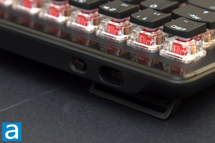 On the back edge, you can see why this Vulcan II Mini Air is slightly deeper than the original one. This is because we have some wireless functions. On the back left side, you can find a USB Type-C port to plug the keyboard in for charging or wired operation, while a flat power switch is situated right beside. Not shown in the photo, but on the other side of the back area, is a small slot to hold the wireless USB transmitter. In terms of its wireless operation, ROCCAT has implemented a few nice features. First, it can connect via the USB dongle or via Bluetooth v5.1. The Vulcan II Mini Air can save up to three Bluetooth-capable devices. You can pick which device to connect to using the secondary functions located from T to I letters.