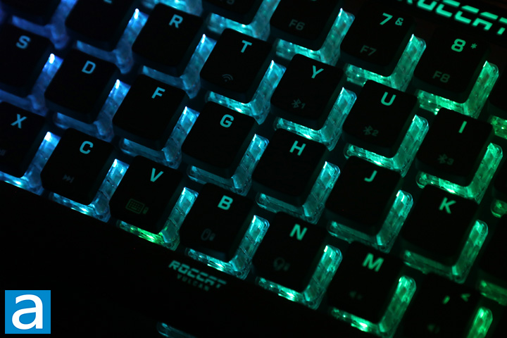 ROCCAT has always had great lighting on their island-style keyboards ever since the Vulcan 120 AIMO. With their dual north- and south-facing LEDs, we have an even more vibrant look. Primary LEDs above the switches work well in dispersing light through the legends. They also shine nicely since the switches have a clear body. The downward-facing LED lights only shine when Fn is pressed. This is a great implementation of showing the secondary functions. Otherwise, lighting can be changed in brightness by using Fn + Page Up or Page Down. Pressing Fn + Right Ctrl will turn on and off the lights as well. ROCCAT has also implemented changing the lighting effects by using the directional cluster. Left and Right cycle through the effects, while Up and Down are used for changing the colors in the static color mode. More effects can be changed in the ROCCAT Swarm software. Overall, the lights were smooth with gradient effects while also very vibrant. The colors were slightly cooler, which was noticeable on the white color, but they looked excellent.
