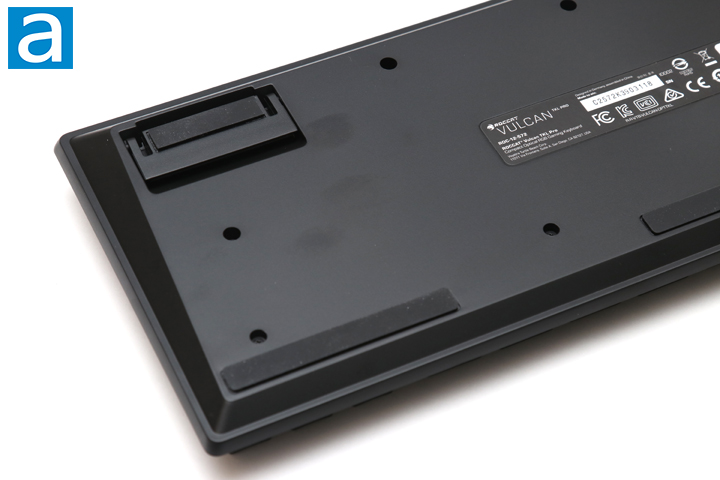 Flipping to the back side, you can see the label with some certification information as well as a serial number to identify your ROCCAT Vulcan TKL Pro. In the center at the back of the keyboard is where the detachable cable would come out of. This end is terminated with a USB Type-C plug, which is something I am happy to see. This cable measures approximately 1.8m in length and is decently flexible. Otherwise, you can see we have rectangular rubber pads on each corner to keep the keyboard in place. The rectangular rubber pads at back are on the extending feet that raise this keyboard. However, these feet are also capped with rubber. This ensures the keyboard stays in place regardless of whether the keyboard is propped up or not.