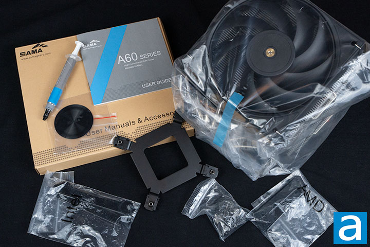 Upon opening the package, I found a cardboard box labeled "User Manuals & Accessories". Inside were the installation brackets, thermal paste, user guide, and a circular plate with "SAMA" written on it. The plate gives you the option to stick the brand name on the front fan of the cooler. Below the cardboard box was a foam slab hiding the heatsink and fan below, which was wrapped in a plastic bag and surrounded with more foam for protection.