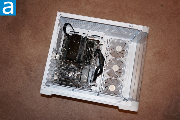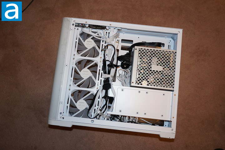 I did not have any hard drives to install for this build, as I was using a single M.2 PCIe NVMe SSD, the Western Digital Black SN750 NVMe SSD mounted directly on the motherboard. The rest of the installation process went very smoothly. With the seven 120mm fans already pre-installed and plugged into the hub, it was just a matter of plugging in the power and PWM connectors to get them running. The large cutout beside the motherboard tray proved to be very handy as well. As shown in the photo above, the thick motherboard power cable fit easily through the opening, with plenty of space left for additional cables.