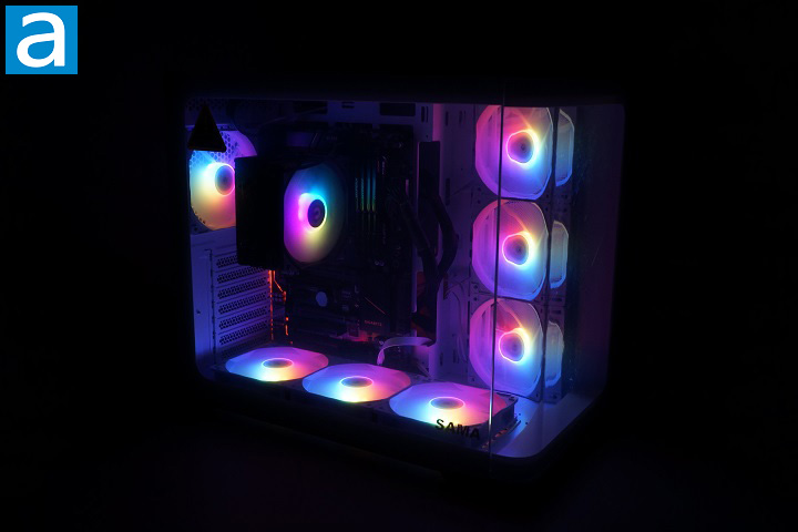 With everything installed, it was finally time to press the power switch. Once powered on, the SAMA V60 delivers a striking ARGB LED lighting display. The glass front panel design allows the lighting effects to shine through with no obstruction, creating a clean and vibrant look. Personally, I place a lot of importance on noise levels in a PC build. In this setup, I had three fans running inside the case, and I was pleasantly surprised by how quiet the system was. Thanks in part to the thick tempered glass panel, which helps to dampen the sound. On a scale of 0 to 10, where 0 is completely silent and 10 is comparable to a jet taking off, I would rate this build at about 3.0/10 during normal operation. It is also worth noting that motherboard fan speed controls can reduce noise even further by lowering fan RPMs when the system is not under heavy load.