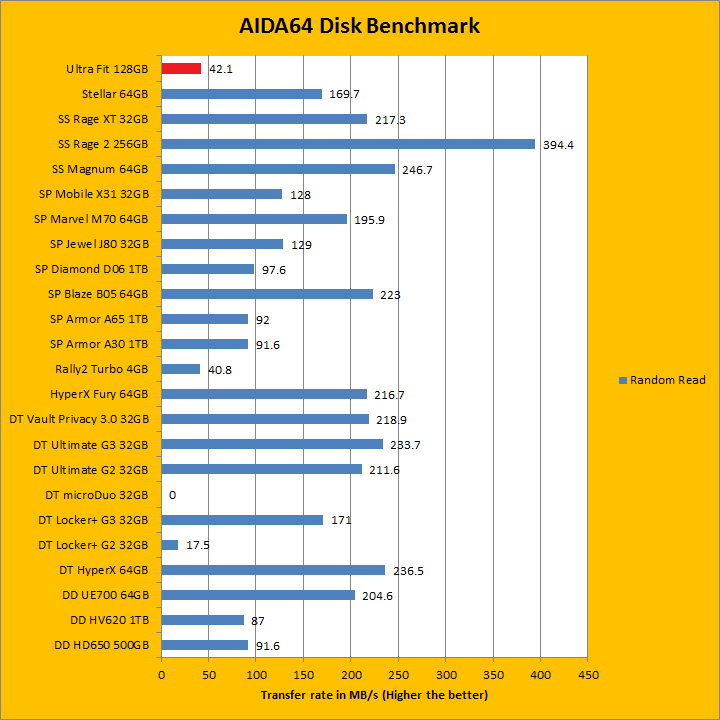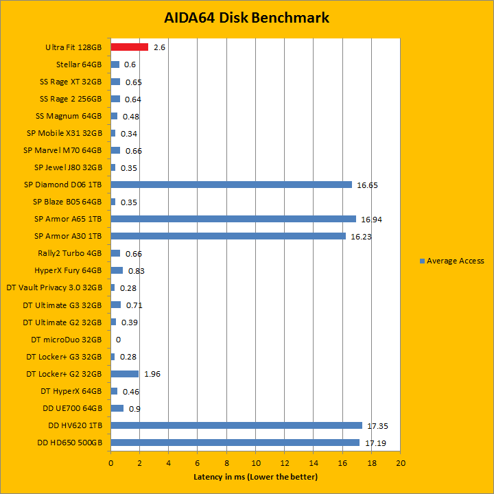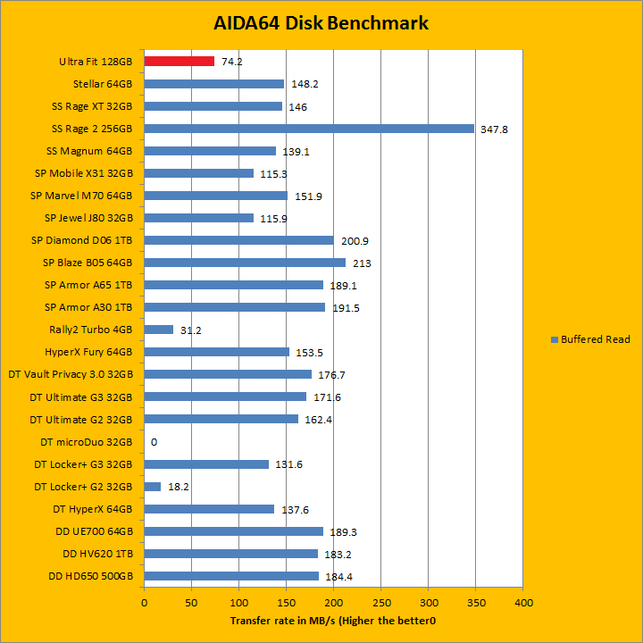 As with all our removable storage reviews, I would just like to make it clear from the start we have a large mix of hard drives and flash drives on the list, so when comparing results, be sure to do so contextually. AIDA64 results provide interesting insight to the performance of the SanDisk Ultra Fit 128GB as an uber tiny USB flash drive. Delivering up to 45.9MB/s sequential read, 42.1MB/s random read, and 74.2MB/s buffered read, it is pretty slow by modern standards, but it is also the physically smallest drive on the list. Its 2.6 ms random access time is also higher than other flash devices. So far, for 128GB of USB 3.0 storage, the Ultra Fit is certainly no speed demon.