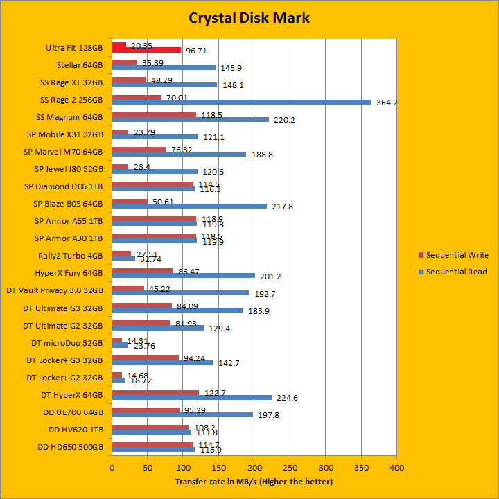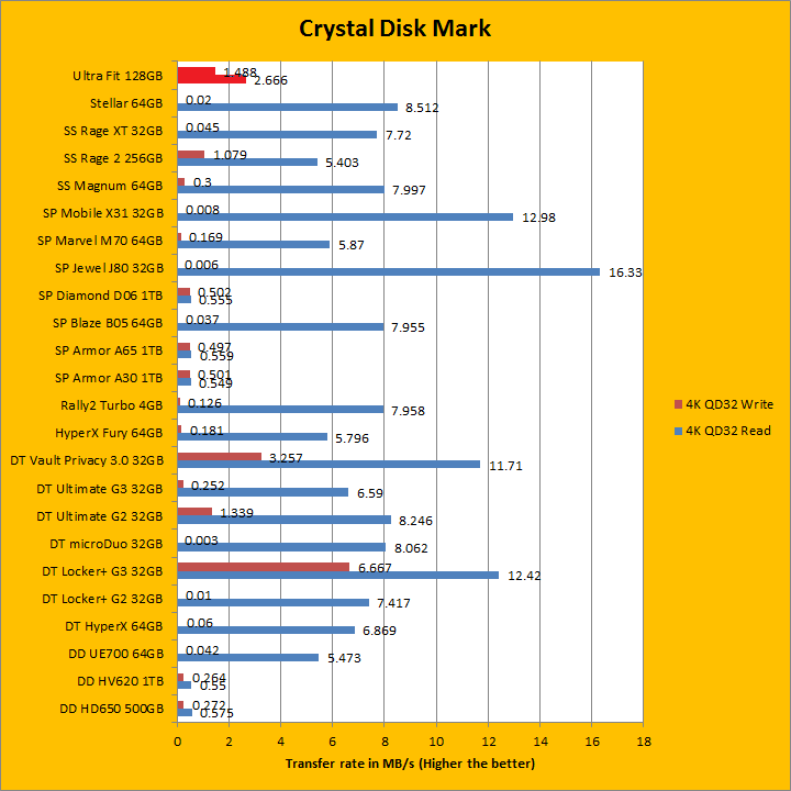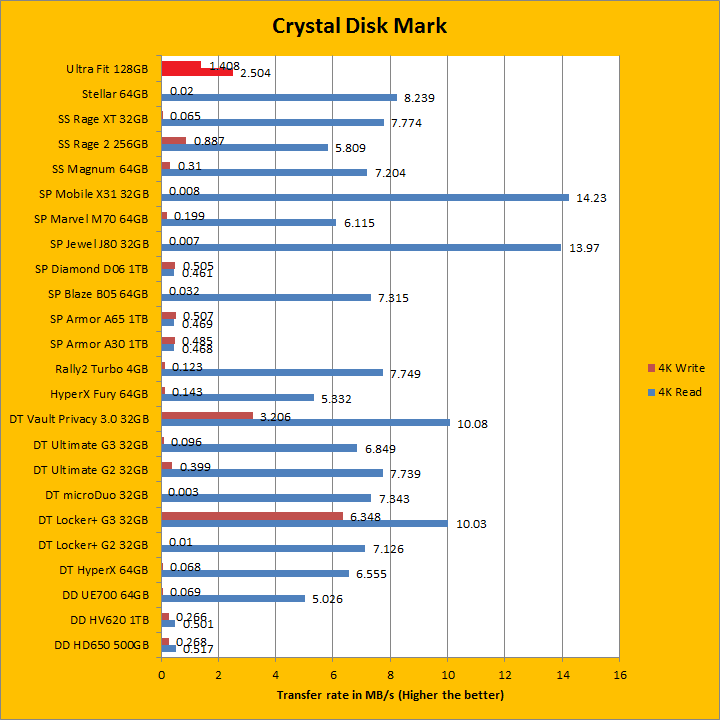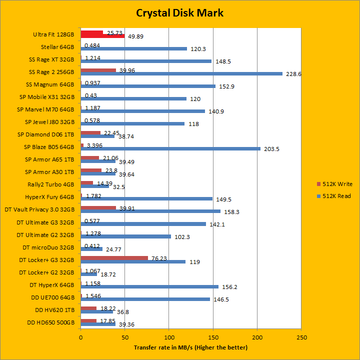 The SanDisk Ultra Fit 128GB continued to perform in accordance to its physical size as we move into our Crystal Disk Mark sequential read and write results. However, there were quite a number of surprises in the remaining results. Its 512K, 4K, and 4K QD32 write performance clearly punched above its class; traditionally USB flash drives perform fairly poorly in these areas, but the SanDisk Ultra Fit delivered beyond expectations. The rest of the results were relatively modest, and they were about where I would expect them to be, once again considering its small physical size. Its sequential read and write results generally reflect what we have seen in the past two pages. As aforementioned, the biggest surprise came in when we shift our focus to the 512K write results. The Ultra Fit came in third, just behind the encrypted Kingston flash drives, where they traditionally dominated. As we move into the 4K and 4K QD32 territory, which requires high input/out operations per second (Commonly referred to as IOPS), the SanDisk Ultra Fit 128GB continued to outperform all the other tested USB flash drives in the write portion. Of course, its read performance was handily outperformed by its bigger and faster counterparts, but this was to be expected.