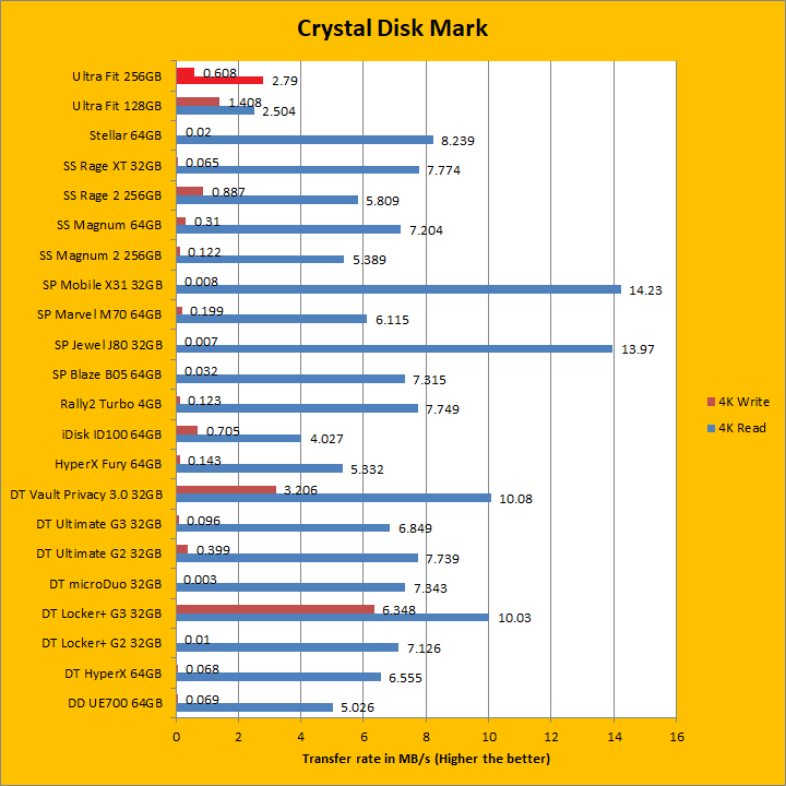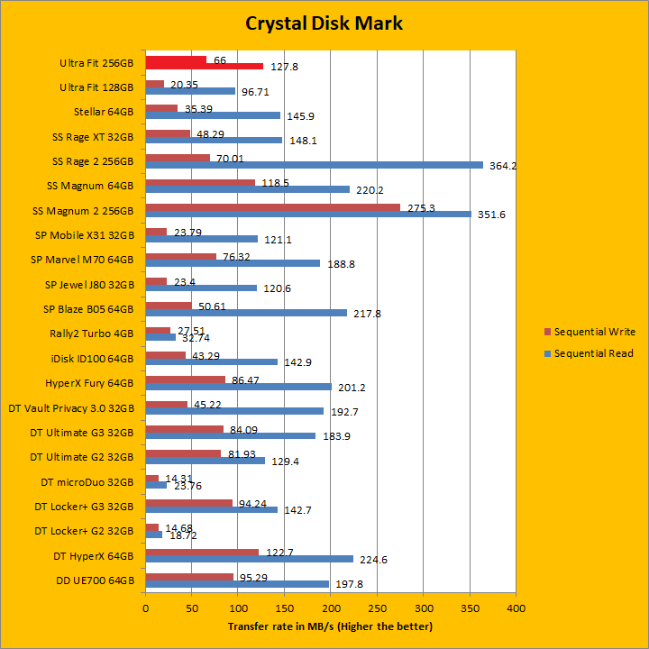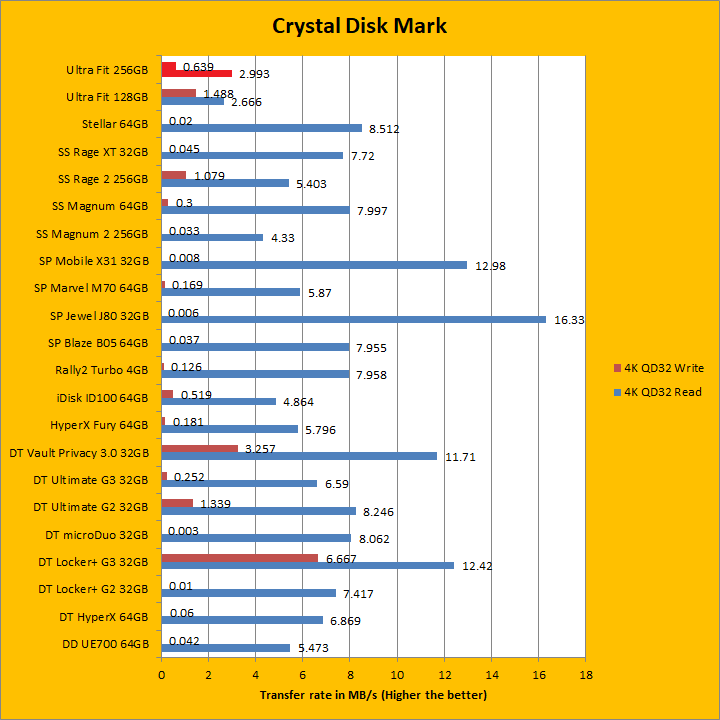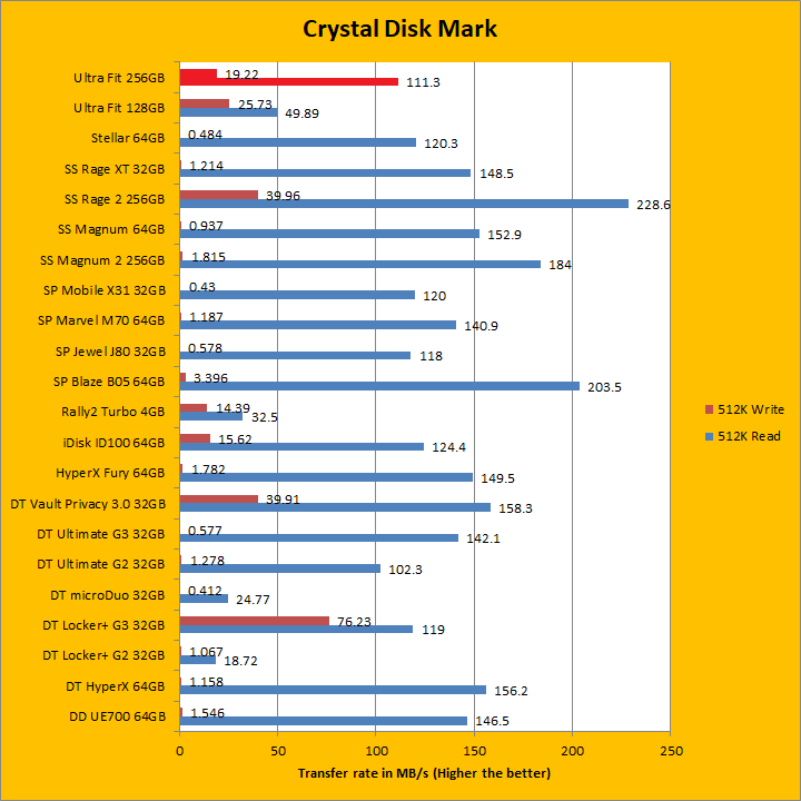 The SanDisk Ultra Fit 256GB continued to perform in accordance to its physical size as we move into our Crystal Disk Mark sequential read and write results. However, there were quite many surprises in the remaining results. Its 512K, 4K, and 4K QD32 write performance clearly punched above its class; traditionally USB flash drives perform poorly in these areas, but the SanDisk Ultra Fit 256GB delivered beyond expectations. Although its 4K and 4K QD32 write results were a step back from its predecessor, corresponding read figures showed considerable improvement. The rest of the results were relatively modest, and they were about where I would expect them to be, once again considering its small physical size. Its sequential read and write results generally reflect what we have seen in the past two pages; again, a considerable improvement over the first-generation model. As aforementioned, the biggest surprise came in when we shift our focus to the 512K write results. The Ultra Fit 256GB came in fourth, just behind the Ultra Fit 128GB. As we move into the 4K and 4K QD32 territory, which requires high input/out operations per second (Commonly referred to as IOPS), the SanDisk Ultra Fit 256GB continued to hold its own against other tested USB flash drives in the write portion, despite a performance drop compared to the Ultra Fit 128GB. Of course, its read performance was handily outperformed by its bigger and faster counterparts, but this was to be expected.
