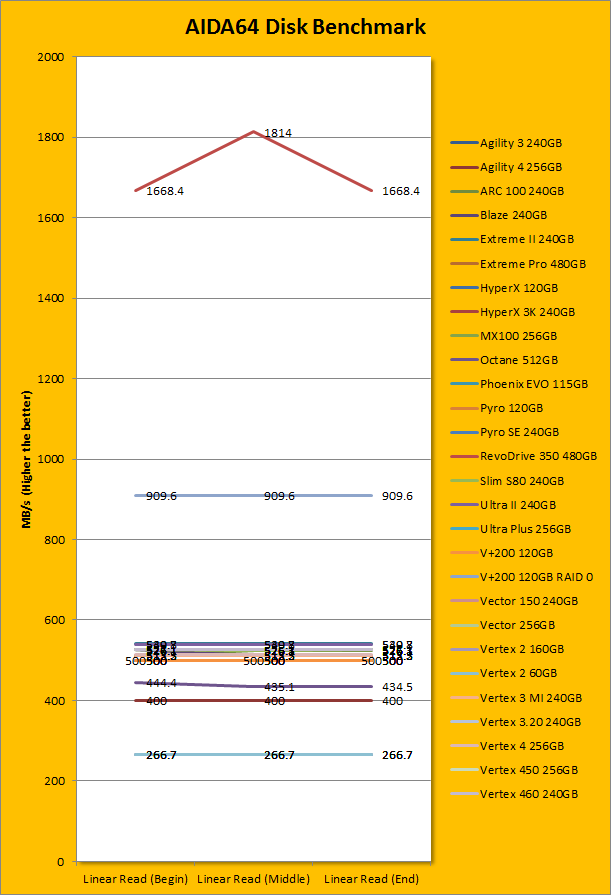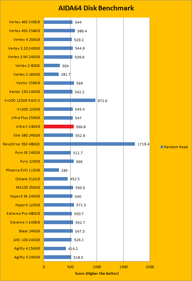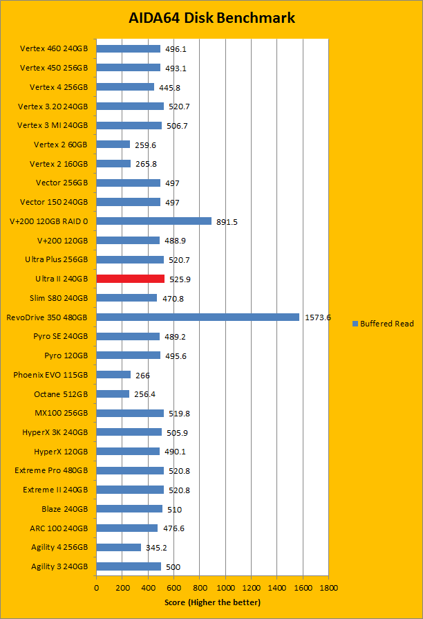 Since our SSD review benchmark results are presented in alphabetical order, first up on the list are results from one of our favorite benchmarking programs, AIDA64 Engineer. Just to note, AIDA64 Engineer is a full synthetic benchmark. Unlike full synthetic motor oil, this usually does not always carry a good connotation. While it is not a representation of real life performance (Such as how fast Photoshop opens), it does provide valuable insight into performance between different drives and different controllers. As you can see in our graphs above, the SanDisk Ultra II 240GB is a little bit faster than both the Crucial MX100 256GB and OCZ ARC 100 240GB, which are value oriented solid state drives priced very similarly. With a linear read speed of 539.8MB/s, random read of 566.8MB/s, and buffered read of 525.9MB/s, these numbers are surprisingly good. The tested random access time is 0.03ms, which is the lowest number we have ever hit, along with a couple of other drives.