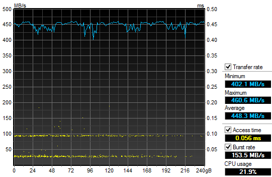 Unfortunately, HD Tune does not generate any fancy independent graph outputs in particular, so I had to edit my screenshot out a bit to make it look better for publishing in a review. Again, like our HD Tach results on the previous page, the line is nice and flat as before. It differs slightly in magnitude than the other program -- probably due to testing algorithms used -- but its performance characteristics are identical in practice. Other than that, the results are commendable across the range; the recorded access time is very low, as we would expect from a solid state drive. The SanDisk Ultra II 240GB posted roughly similar results otherwise for the sequential read speed. Do keep in mind the discussion we had on the previous page, as it still applies here.