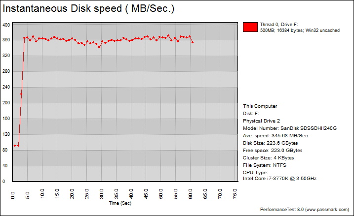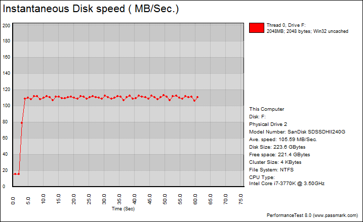PassMark PerformanceTest 8.0's Advanced Disk Test, unlike HD Tune Pro 4.60, generates some awesome graphs right out of the box. It also provides valuable insight in simulating real world performance applications. To make things clear to you, the first graph simulates a database server, followed by a file server, web server, and workstation. Obviously, PassMark PerformanceTest 8.0 uses highly compressible data in most tests some controllers can really take advantage of. However, it also requires high IOPS capabilities for the best score. In the past, Marvell based drives perform pretty well in this test. One thing clear is the SanDisk Ultra II 240GB provided incredibly flat graphs, which is excellent if you are looking for strong consistent performance.