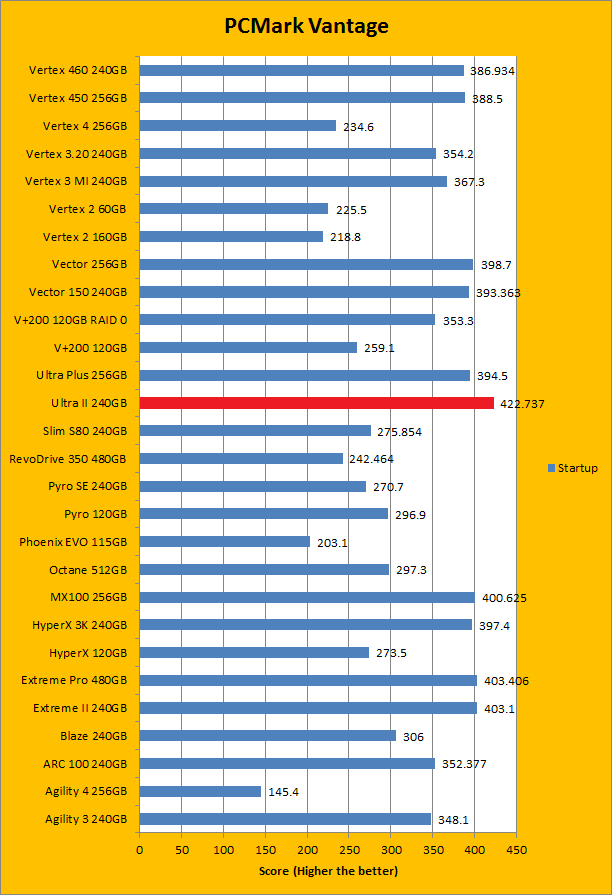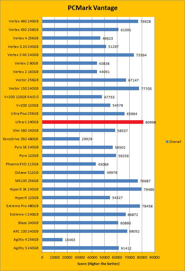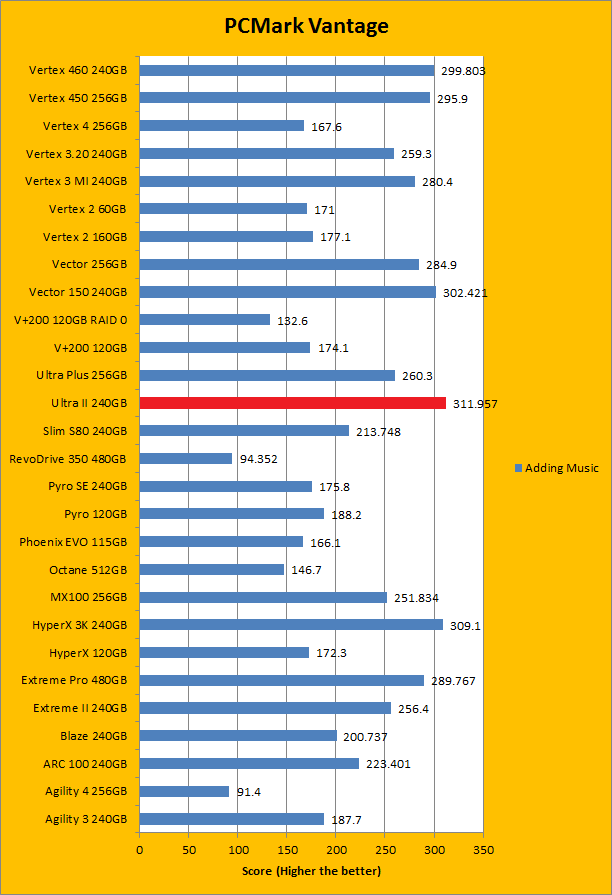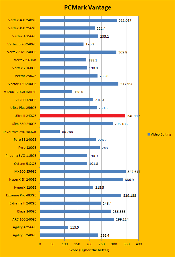 PCMark Vantage aims to shed a little more insight into real life performance of your computer hardware by semi-synthetic means -- and all insight is good, right? The great thing about standardized tests is anyone can repeat them and get very similar results, given identical hardware. Well, I am not going to narrate the stuff above in detail, because we all know graphs are there for a very good reason. Just to give you a bit of insight if you are too lazy to go through all nine comparisons, the SanDisk Ultra II 240GB performed exceptionally well against some of the best drives in the industry. In fact, it took home the highest overall score. PCMark Vantage uses some pretty simple simulations, so it is pretty optimized for single disks with relatively fast linear read (It does funny things when you got a RAID array though). The SanDisk Ultra II 240GB easily beat the OCZ ARC 100 240GB in every single category, and traded blows with the Crucial MX100 256GB repeatedly. The MX100 won five out of eight comparisons -- some by very small margins -- and the Ultra II won the remaining, with some examples having pretty large gaps.