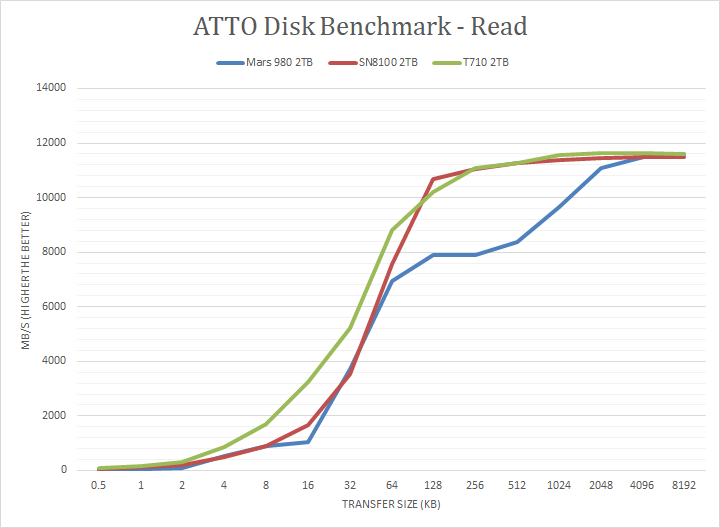 As far as the Silicon Motion SM2508 controller on the SN8100 2TB is concerned, well, here are our results. The Sandisk WD_BLACK SN8100 2TB peaked at 11470MB/s read and 12720MB/s write. Under the read curve, it fell behind the T710, and at points, behind the Mars 980, until 128K. After that, it was marginally faster than the T710.