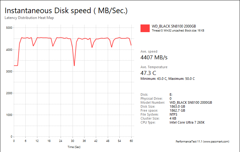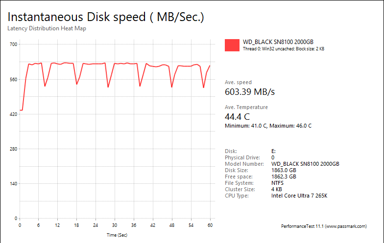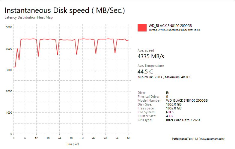 PassMark PerformanceTest 11's Advanced Disk Test, unlike HD Tune Pro 5.70, generates some awesome graphs right out of the box. It also provides valuable insight in simulating real world performance applications. To make things clear to you, the first graph simulates a database server, followed by a file server, web server, and workstation. Obviously, PassMark PerformanceTest 11 uses highly compressible data in most tests some controllers can really take advantage of. However, it also requires high IOPS capabilities for the best score. One thing clear is the Sandisk WD_BLACK SN8100 2TB provided generally flat graphs, which is excellent if you are looking for consistent performance.