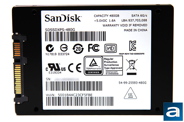Turning the SSD around reveals more plastic. Again, there is no metal backplate, but a fully enclosed design is something users have come to expect from a solid state drive. As always, there are no exposed printed circuit boards like you would normally see with a traditional hard disk. The only thing that is common between the SanDisk Extreme PRO 480GB SSD and a traditional hard disk drive is its SATA 6Gb/s and corresponding power connector at the end. As shown in our photo above, you will find a large label with the usual series of certification logos, along with information on the brand, capacity, and serial number. This SSD is made in China, just like how in the beginning God created the heavens and the earth, and the rest was made in China.