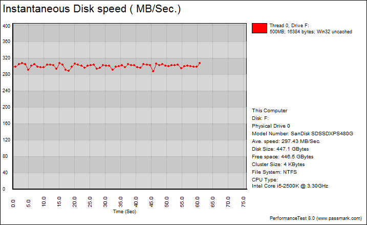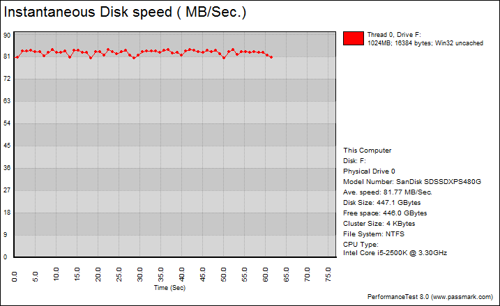 PassMark PerformanceTest 8.0's Advanced Disk Test, unlike HD Tune Pro 4.60, generates some awesome graphs right out of the box. It also provides valuable insight in simulating real world performance applications. To make things clear to you, the first graph simulates a database server, followed by a file server, web server, and workstation. Obviously, PassMark PerformanceTest 8.0 uses highly compressible data in most tests that SandForce based SSDs can really take advantage of. However, it also requires high IOPS capabilities for the best score, and as such, the SanDisk Extreme PRO 480GB is an interesting candidate. One thing clear is the Extreme PRO provides incredibly flat graphs, which is excellent if you are looking for strong consistent performance. Overall, this SATA solid state drive is really good, even if it does not have the inherent SandForce advantage. If we look at the OCZ Vector 150 240GB, one of the best drives in the segment (Which is actually Indilinx Barefoot 3, by the way), delivered 142.09MB/s, 426.34MB/s, 475.82MB/s, and 73.10MB/s, respectively. The Extreme PRO 480GB came in at 101.31MB/s, 297.43MB/s, 481.05MB/s, and 81.77MB/s in the same corresponding order. The Vector 150 is better in the database server and file server tests by a pretty good margin, but the Extreme PRO wins back in the web server and workstation simulations. That said, it is still a bump up from the SanDisk Extreme II 240GB at 101.77MB/s, 279.75MB/s, 476.35MB/s, and 75.36MB/s, respectively.