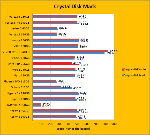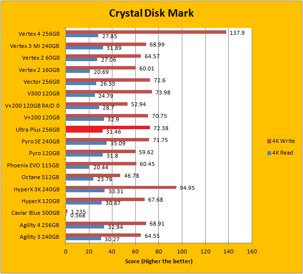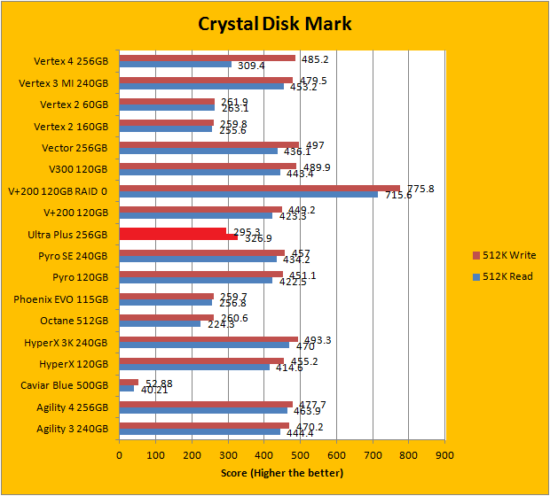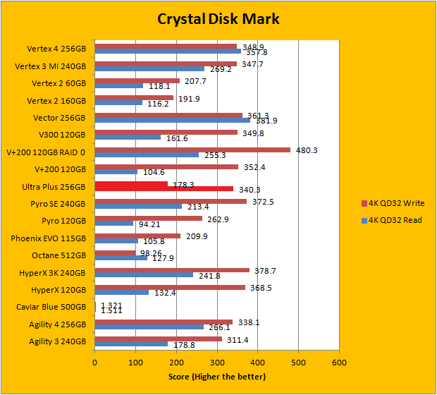 Crystal Disk Mark 3.0 is in the spotlight. Just a bit of background information; higher capacity drives tend to perform a little better in these tests. Although the SanDisk Ultra Plus 256GB did not post earth shattering numbers in any of the results, it still remained reasonably competitive against our large array of high performance solid state drives from various manufacturers. In this particular benchmark, the ability of a controller and flash memory to deliver high IOPS will provide huge benefits to the score. The Ultra Plus, to some extent, bucks the SandForce performance signature, which is pretty interesting -- you can read and compare our results above.