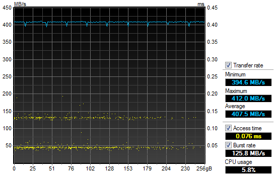 Unfortunately, HD Tune does not generate any fancy independent graph outputs in particular, so I had to edit my screenshot out a bit to make it look better for publishing in a review. Again, like our HD Tach results on the previous page, the line is nice and flat as before. It differs slightly in magnitude than the other program -- probably due to testing algorithms used -- but its performance characteristics are identical in practice. Other than that, the results are very commendable across the range; and the recorded access time is virtually nil. The SanDisk Ultra Plus 256GB posted impressive results; cracking the 400MB/s mark once again. That said, do keep in mind the discussion we had on the previous page, as it still applies here.