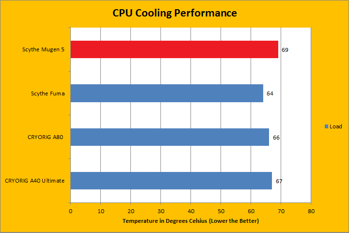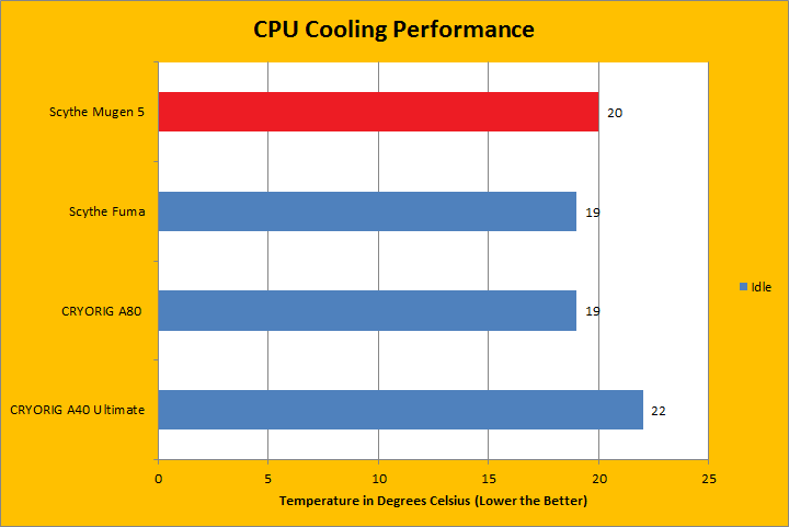All tests were run in our custom built computer to best reflect real life performance. The computer remained in the same place and room for all tests. The ambient temperature of the room was roughly 22 degrees Celsius. The thermal paste applied to each cooler was stock respective to their manufacturer's to rate its performance. Sufficient time between testing was applied for the paste to settle. The fans on all heatsinks were connected to the same motherboard 4-pin connector. The test computer was turned on and idling for at least one hour for the idling tests. High CPU load results were obtained using the Prime95 in place large FFTs test with four worker threads for a minimum of fifteen minutes, and recorded when the temperature was deemed stable. The Mugen 5 was tested using the stock fan from factory. The performance was compared with another air cooled CPU cooler from Scythe -- the Fuma, and two water cooled CPU coolers from CRYORIG, namely the A80 and A40 Ultimate. The purpose of doing such tests was not for a performance competition, since they were quite different in terms of design and targeted market; it is only for some comparison. The temperature results for each cooler was measured with CoreTemp, which reports the CPU's integrated digital thermal sensor for maximum accuracy. Each temperature result was calculated by taking the maximum value of the cores inside the CPU.