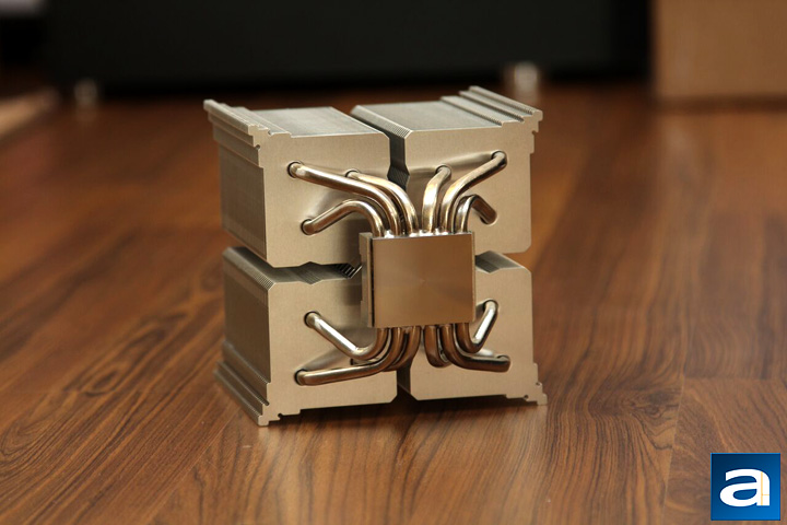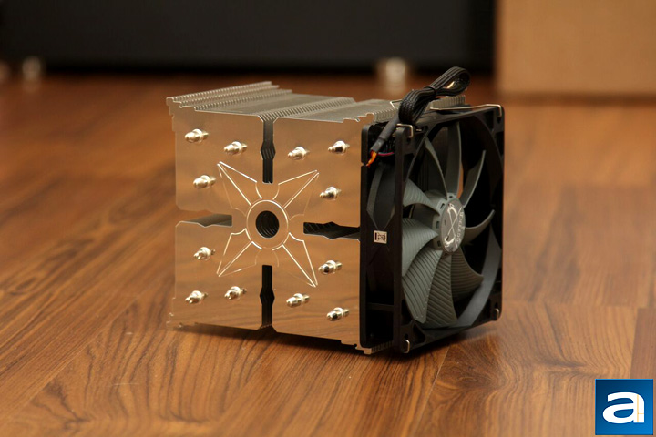 Big. The Scythe Ninja 4 is big. The cooler is not as heavy as I expected after I saw how monstrous it was, but it was by no means a light heatsink. Without the fan, it weighs in at 780g, and with the fan at 900g. From the top down, you can see it looks like it has four parts to it. However, on closer inspection, there are only two cooling towers and three heatpipes ending at the top of each of the cooling towers. I really like the shuriken stamped onto the top of the Scythe Ninja 4, as it really drives home the ninja theme of the product. We will find out if it is as deadly and silent as its namesake later on. The symmetrical look from the top down is really nice, making it a good sight to see inside your chassis. The Scythe Ninja 4 has a simple look with its silver finish, with the black and gray of the fan. If you are concerned with the theme of your PC build, these colors are least likely to clash with your build. This is especially true if you have LED lighting; the silver of the heatsink will just reflect the color, and in my case it gives pretty clean and cool look. Between each of the two cooling towers, you can see there is a little circle about midway from the side and the middle of the shuriken. That is not there for any aesthetic reasons, but actually for the extra-long screwdriver they included to attach the heatsink to the mounting hardware.