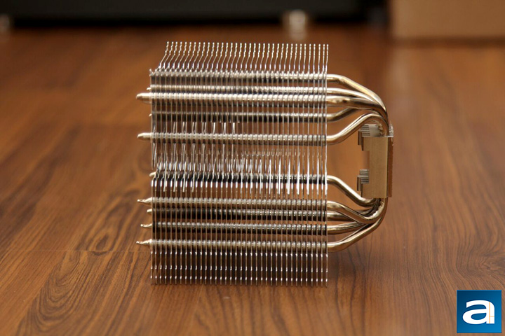 Taking a step back, and looking at it from the side, it is easy to see the orientation of the heatpipes, and how they run into the fin stack. Something to take into consideration is the heatpipes are not soldered to the fins of the heatsink. At first, this is not an issue, but should be taken into account in the long term, because you will experience a drop in performance after many cycles of expansion and contraction. The fins are separated by about 2mm. With 36 aluminum fins, the size of the Scythe Ninja 4 really means it has a large surface area to optimize heat dissipation. The gap on top of the base plate is actually for the mounting hardware, which may give you a better idea why they included an extra-long screwdriver. The Scythe Ninja 4 comes in at a width of 130 mm, height of 155 mm, and depth of 153 mm. If you have a smaller chassis, you should make sure there will not be any clearance issues. It would be pretty awkward installing a nice big heatsink only to find that the side panel does not close anymore. The symmetrical design may cause some clearance issues with your memory modules if you have medium to high profile heatspreaders on them. These factors have to be taken into consideration when installing the Scythe Ninja 4. If the fan only interferes with your RAM, it is possible to just offset the fan a bit for additional clearance.