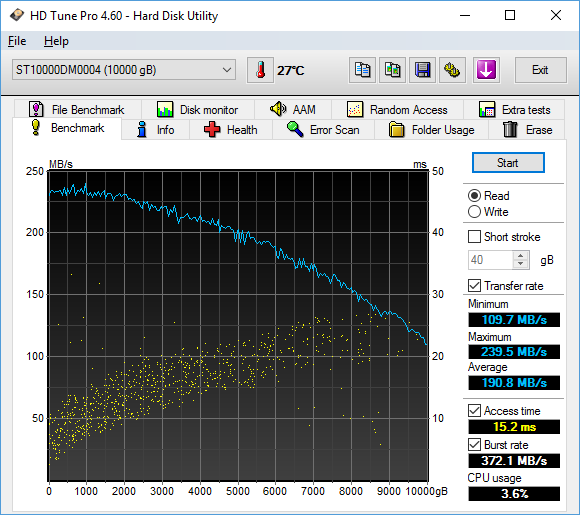 Unfortunately, HD Tune does not generate any fancy independent graph outputs in particular, so I only took a screenshot of the program to publish in this review. Somewhat unlike our HD Tach results on the previous page, the line was standard fare for a hard drive -- faster near the beginning, and slowly drops off as we move away from the center of the platter. It differed slightly in magnitude than the other program as well -- probably due to testing algorithms used -- but its performance characteristics is really identical in practice. Other than that, the results were excellent across the range for a drive of this caliber; peaking at 239.5MB/s and holding a minimum of 109.7MB/s. In fact, it was almost 15MB/s faster on average compared to its corporate cousin, the IronWolf 10TB. Do keep in mind the discussion we had on the previous page, as it still applies here.