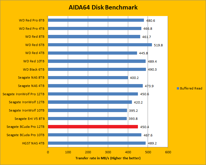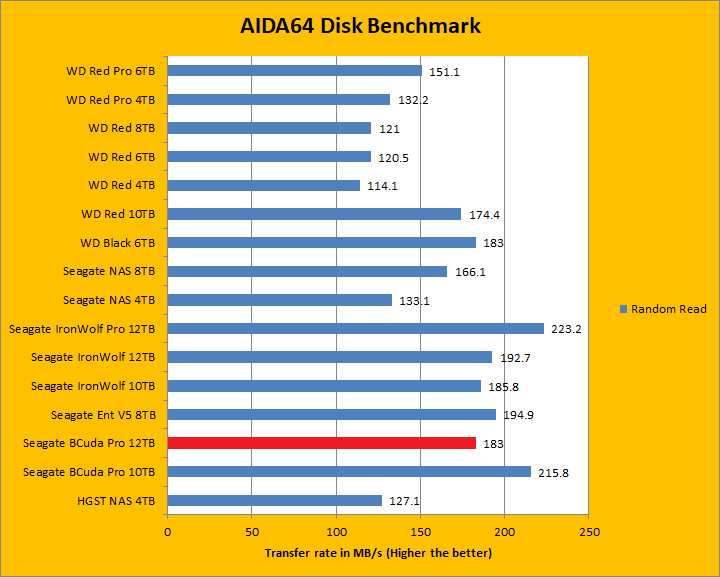 Since our storage review benchmark results are presented in alphabetical order, first up on the list are results from one of our favorite benchmarking programs, AIDA64 Engineer. Just to note, AIDA64 Engineer is a full synthetic benchmark. Unlike full synthetic motor oil, this usually does not always carry a good connotation. While it is not a representation of real life performance -- such as how fast you can copy movies to your drive -- it does provide valuable insight into performance variation between drives from different manufacturers. As you can see in our graphs above, the latest 7,200 RPM BarraCuda Pro ST12000DM0007 12TB delivered top notch performance in the linear read segment; posting some of the fastest rates on the board. It clocked in at 255.8MB/s in the beginning of the drive, 210.4MB/s in the middle, and finishing with 114.6MB/s in the end. This is faster than its 10TB variant as well as the Seagate IronWolf Pro 12TB, although it came in marginally behind the IronWolf 12TB. Its 13.90ms random access time was a little higher than the IronWolf Pro 12TB and a little lower than the IronWolf 12TB; meaning it is still no match for the WD Black's 11.45ms and Enterprise Capacity 3.5 HDD V.5's 11.58ms.