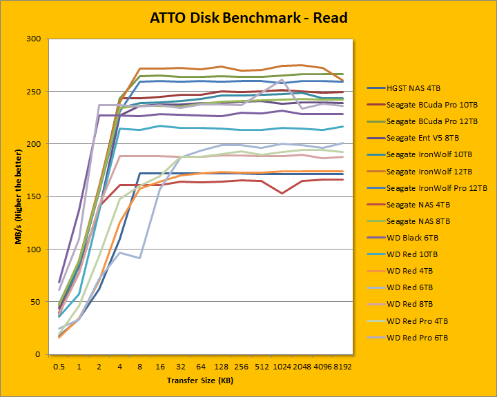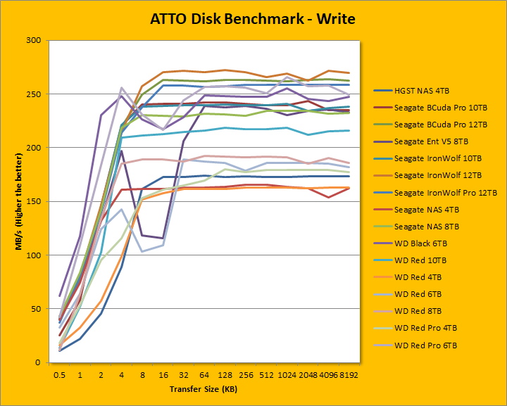 Following up next is our usual ATTO read and write tests. ATTO is an often-quoted benchmark, because it is easy to use and accurate. For the most part, it is a favorite among reviewers, and I have grown to embrace it as much as the next for the last little while. By varying the file transfer size, you can visually see how each product performs across the curve. In the Read section, the Seagate BarraCuda Pro ST12000DM0007 12TB performed quite well, but it was not as good as the WD Black 6TB and WD Red Pro 6TB. Its ramp up speed profile was very similar to the Seagate BarraCuda Pro 10TB, IronWolf Pro 12TB, and IronWolf 12TB, which, in a traditional Seagate fashion, was very good. The BarraCuda Pro ST12000DM0007 reached close to peak rate at 4K and above, which was quite quick. Its peak rate came in at 266.437MB/s, which was second only to the IronWolf at 275.036MB/s, and beating its 10TB BarraCuda counterpart at 250.289MB/s; all crazy fast by 2017 standards. In the Write section, it also reached its peak rate at 4K and above. With a top write speed of 263.818MB/s, this, again, was incredible in coming in just behind the IronWolf 12TB at 271.695MB/s. It still could not beat the WD Red Pro 6TB and Black 6TB in ramp up speed, although the ST12000DM0007 was a considerable improvement compared to the Seagate BarraCuda Pro 10TB from 0.5K to 1K.