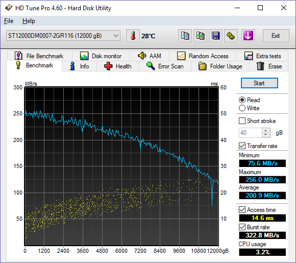 Unfortunately, HD Tune does not generate any fancy independent graph outputs in particular, so I only took a screenshot of the program to publish in this review. Somewhat unlike our HD Tach results on the previous page, the line was standard fare for a hard drive -- faster near the beginning, and slowly drops off as we move away from the center of the platter. It differed slightly in magnitude than the other program as well -- probably due to testing algorithms used -- but its performance characteristics is really identical in practice. Other than that, the results were excellent across the range for a drive of this caliber; peaking at 256.0MB/s and holding a minimum of 75.6MB/s. These results are not too different than the pair of IronWolf 12TB drives. Do keep in mind the discussion we had on the previous page, as it still applies here.