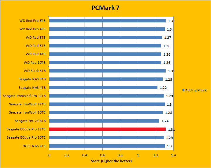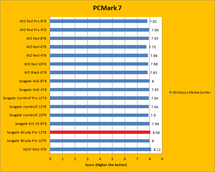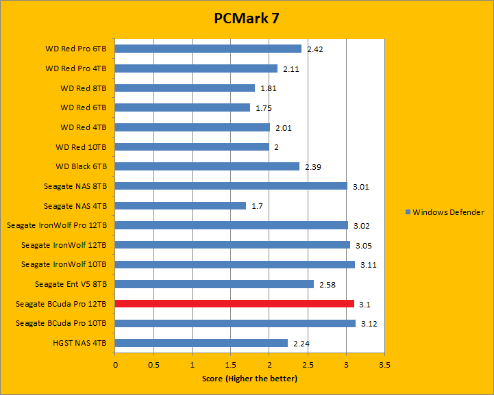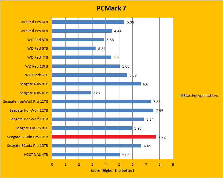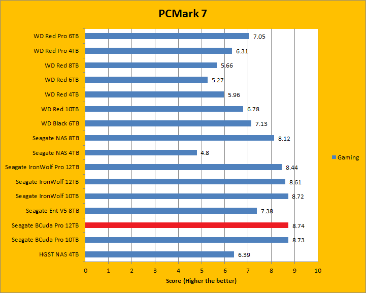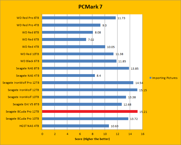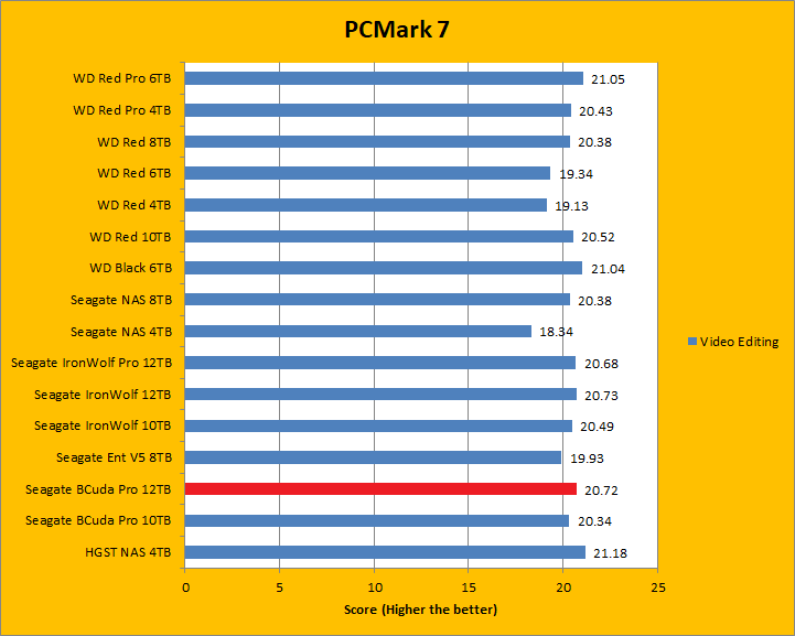 PCMark 7 aims to shed a little more insight into real life performance of your computer hardware by semi-synthetic means -- and all insight is good, right? The great thing about standardized tests is anyone can repeat them and get very similar results, given identical hardware. PCMark 7 is a Windows desktop environment based test, which is exactly what we are after. Well, I am not going to narrate the stuff above in detail, because we all know graphs are there for a very good reason. As you can see in our results above, the BarraCuda Pro ST12000DM0007 was the fastest pure mechanical hard drive in the overall score; beating the pair of IronWolf 12TB HDDs as well as the BarraCuda Pro 10TB. The BarraCuda Pro 12TB was consistently among the top, if not at the top, against other hard drives in each simulation segment, which was very impressive.
