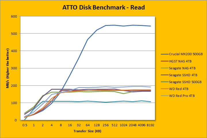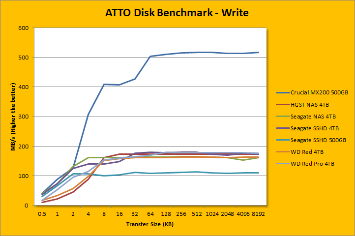 Following up next is our usual ATTO read and write tests. ATTO is an often quoted benchmark, because it is easy to use and accurate. For the most part, it is a favorite among reviewers, and I have grown to embrace it as much as the next for the last little while. By varying the file transfer size, you can visually see how each product performs across the curve. It does not exactly cache ATTO data either, but I am seeing some inconsistencies between runs. As such, I took the most consistent run, and used it for our results today. In the Read section, the Seagate Desktop SSHD ST4000DX001 4TB followed a pattern quite similar to the Seagate NAS HDD. Its ramp up speed was faster than any other tested hard drive -- other than the Seagate NAS HDD -- in the beginning; only trailing the Crucial MX200 500GB solid state drive. It quickly reached maximum performance at 4K and above, which is quite unusual for a storage device. Its peak rate came in at 180.158MB/s. Compared to the MX200's 516.222MB/s statistic, you can park a Boeing 747 in between, but it remained relatively competitive in the sea of desktop hard drives. In the Write section, it quickly reached its peak rate at 32K and above, but it was already at 140MB/s at 4K. With a top read speed of 179.958MB/s in uncached mode, this was pretty good for a 5,900RPM desktop hard drive with 1TB platters. In fact, it was consistently faster than the Seagate NAS HDD at larger file transfer sizes.