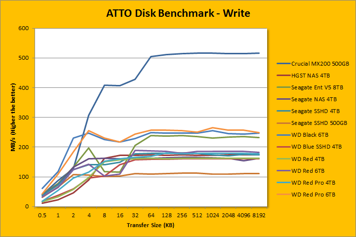 Following up next is our usual ATTO read and write tests. ATTO is an often quoted benchmark, because it is easy to use and accurate. For the most part, it is a favorite among reviewers, and I have grown to embrace it as much as the next for the last little while. By varying the file transfer size, you can visually see how each product performs across the curve. In the Read section, the Seagate Enterprise Capacity 3.5 HDD V.5 ST8000NM0055 8TB performed quite well, but it was not as good as the WD Black 6TB and WD Red Pro 6TB. Its ramp up speed profile was quite similar to the Seagate NAS HDD and Desktop SSHD, which, in a traditional Seagate fashion, was very good. However, Western Digital's latest models took it up to a whole new level. The Enterprise Capacity 3.5 HDD V.5 reached close to peak rate at 4K and above, which is quite quick. Its peak rate came in at 240.749MB/s, which is second only to the WD Red Pro 6TB at 261.251MB/s; all crazy fast by 2016 standards. In the Write section, it also reached its peak rate at 4K and above. With a top write speed of 239.12MB/s, this, again, was incredible. Meanwhile, the WD Red Pro 6TB peaked at 265.777MB/s, and like the Black 6TB, both had a faster ramp up speed than the Seagate ST8000NM0055 8TB.