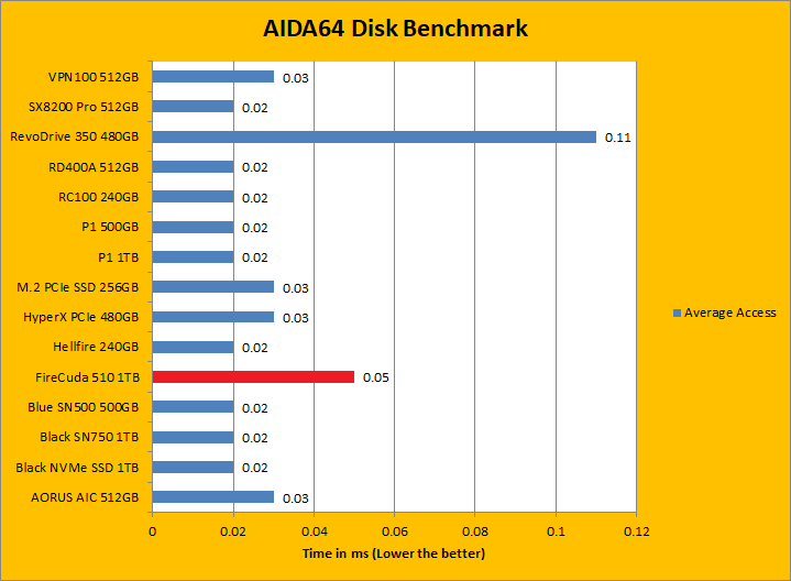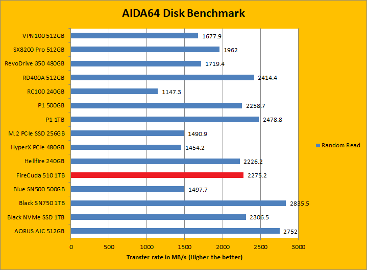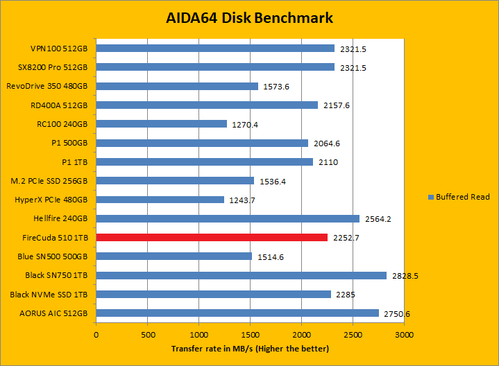 Since our SSD review benchmark results are presented in alphabetical order, first up on the list are results from one of our favorite benchmarking programs, AIDA64 Engineer. Just to note, AIDA64 Engineer is a full synthetic benchmark. Unlike full synthetic motor oil, this usually does not always carry a good connotation. While it is not a representation of real life performance -- such as how fast Photoshop opens -- it does provide valuable insight into performance between different drives and different controllers. As you can see in our graphs above, the Seagate FireCuda 510 1TB scored consistently average at just under 2300MB/s in the linear read segment. Surprisingly, the tested latency was quite a bit higher than the average at 0.05ms. The rest of the comparison results against all the other drives can be seen in our graphs above.