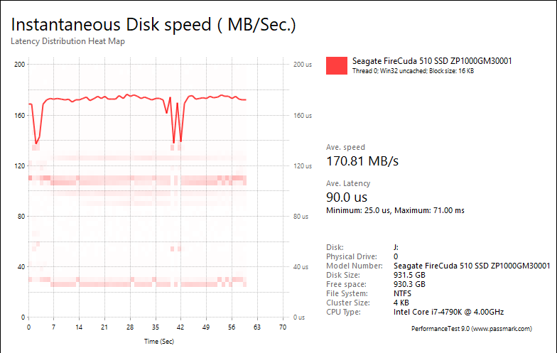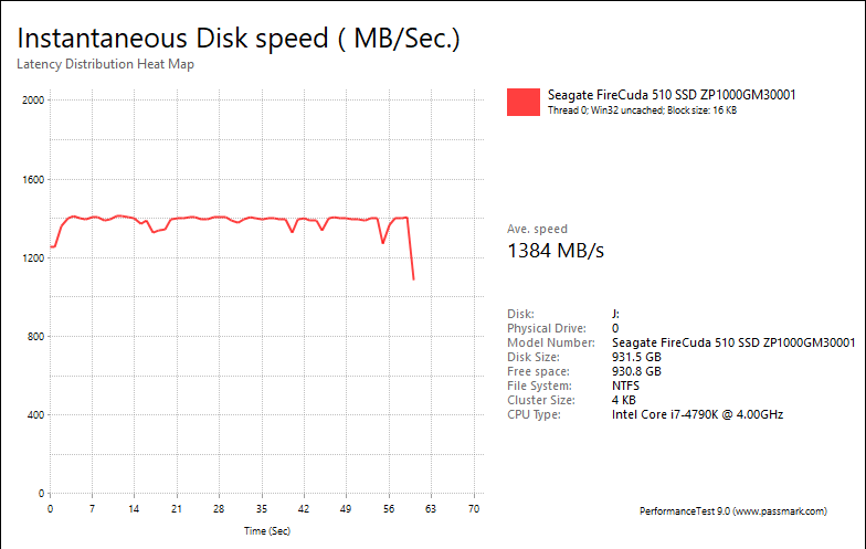 PassMark PerformanceTest 9.0's Advanced Disk Test, unlike HD Tune Pro 5.70, generates some awesome graphs right out of the box. It also provides valuable insight in simulating real world performance applications. To make things clear to you, the first graph simulates a database server, followed by a file server, web server, and workstation. Obviously, PassMark PerformanceTest 9.0 uses highly compressible data in most tests some controllers can really take advantage of. However, it also requires high IOPS capabilities for the best score. One thing clear is the Seagate FireCuda 510 1TB provided generally flat graphs, which is excellent if you are looking for consistent performance.