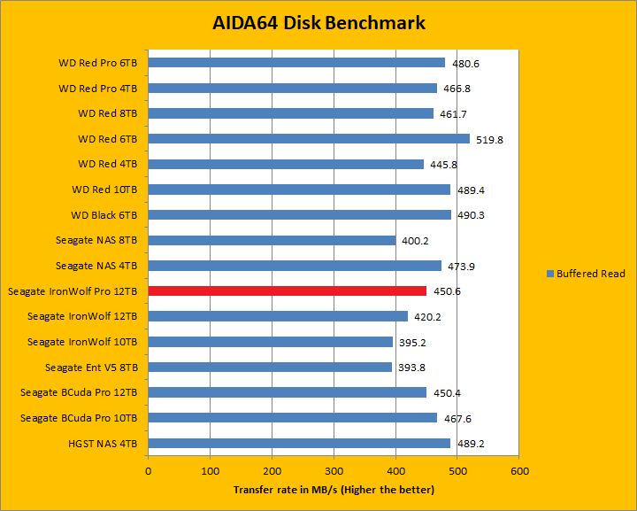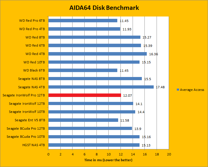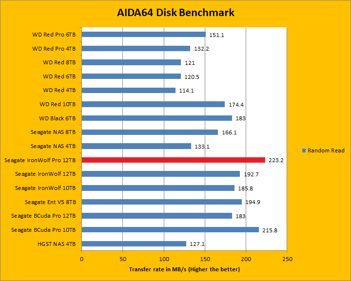 Since our storage review benchmark results are presented in alphabetical order, first up on the list are results from one of our favorite benchmarking programs, AIDA64 Engineer. Just to note, AIDA64 Engineer is a full synthetic benchmark. Unlike full synthetic motor oil, this usually does not always carry a good connotation. While it is not a representation of real life performance -- such as how fast you can copy movies to your drive -- it does provide valuable insight into performance variation between drives from different manufacturers. As you can see in our graphs above, the latest 7,200 RPM IronWolf Pro ST12000NE0007 12TB delivered top notch performance in the linear read segment; posting some of the fastest rates on the board. It clocked in at 250.5MB/s in the beginning of the drive, 207.1MB/s in the middle, and finishing with 111.8MB/s in the end. Surprisingly, this was slower than both the BarraCuda Pro 12TB and IronWolf 12TB; albeit by a hair. Its 12.09ms random access time was lower than both the 12TB corporate cousins by a decent margin though, meaning it is getting closer to WD Black's 11.45ms and Enterprise Capacity 3.5 HDD V.5's 11.58ms.