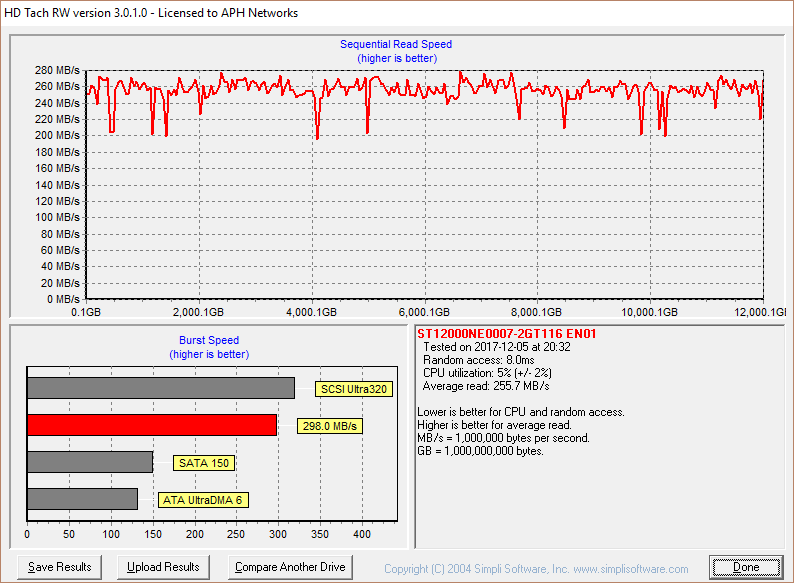 Now, it is the time for good old HD Tach. While HD Tach is more of a 'drag race' than a clear indication of real life performance, and has been around for a really long time, it is an excellent storage performance reference between hard drives for more than the last decade. Back in the days, if your average speed exceeded 60MB/s, you had a seriously fast drive. Where does the Seagate IronWolf Pro ST12000NE0007 12TB come in? With an average read speed of 255.7MB/s and tested random access time of 8.0ms, this is mind-blowingly fast for a mechanical hard drive. But how does it compare against the other products? It is a virtual tie with the Seagate's own BarraCuda Pro 12TB at 256.2MB/s with a 9.2ms access time, but a bit behind the IronWolf 12TB at 267.1MB/s with a 9.0ms access time. Meanwhile, the BarraCuda Pro ST10000DM0004 10TB came in at 243.4MB/s with a 9.4ms access time. The Seagate IronWolf Pro ST12000NE0007 is not only one of the fastest mechanical hard drive ever tested in HD Tach here at APH Networks, it also has the best random access time.