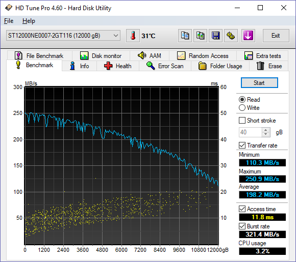 Unfortunately, HD Tune does not generate any fancy independent graph outputs in particular, so I only took a screenshot of the program to publish in this review. Somewhat unlike our HD Tach results on the previous page, the line was standard fare for a hard drive -- faster near the beginning, and slowly drops off as we move away from the center of the platter. It differed slightly in magnitude than the other program as well -- probably due to testing algorithms used -- but its performance characteristics is really identical in practice. Other than that, the results were excellent across the range for a drive of this caliber; peaking at 250.9MB/s and holding a minimum of 110.3MB/s. These results are not too different than the other Seagate 12TB drives. Do keep in mind the discussion we had on the previous page, as it still applies here.