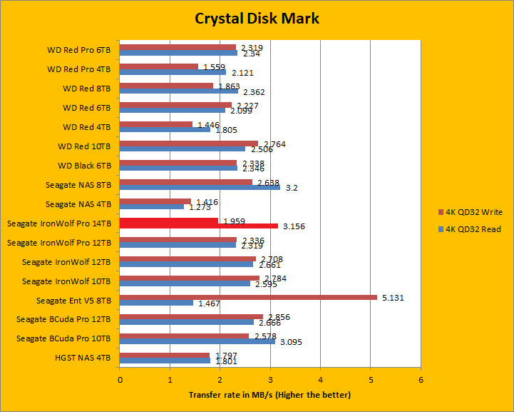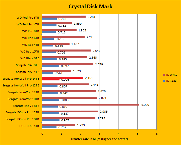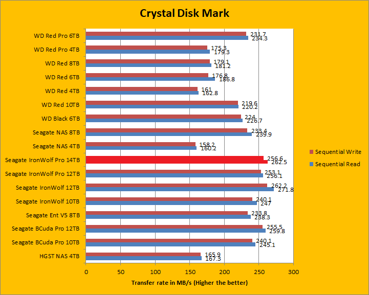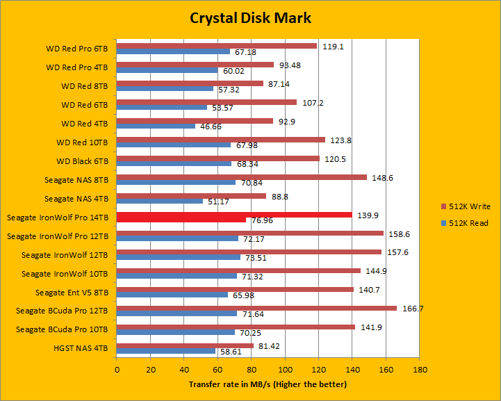 Crystal Disk Mark 3.0 is in the spotlight. Crystal Disk Mark is an important benchmark, because it tests the input/output operations per second capability of the storage device. As you can see in our charts above, compared against a few select drives; namely, hard drives from HGST, Seagate, and Western Digital, the 7,200RPM IronWolf Pro 14TB performed fairly well. For a drive of this caliber, these results were very good, especially in the sequential read/write and 512K read/write segments. In fact, it dominated across the board in the read tests. Its 4K and 4K QD32 write performance was obviously no match against the workload optimized Enterprise Capacity 3.5 HDD V.5, but it also fell into the shadow of the BarraCuda Pro 12TB and IronWolf Pro 12TB, which was surprising and a little disappointing. Generally speaking, the Seagate IronWolf Pro ST14000NE0008 14TB was competitive or class-leading in most of the tests. I will let you take a look at the results in our comparison graphs above.