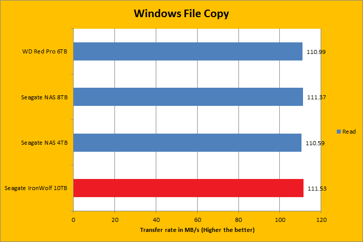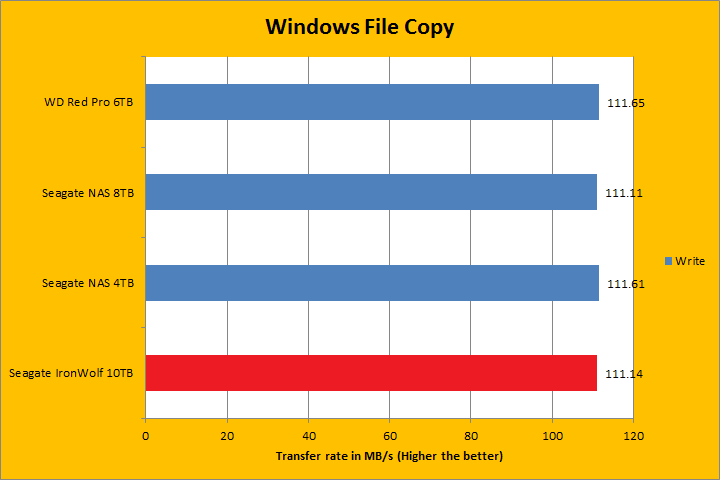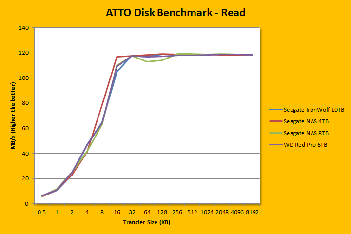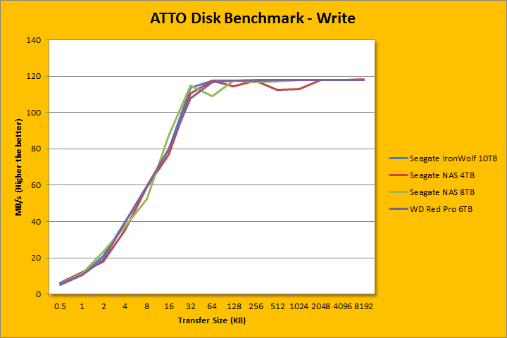 ATTO disk benchmark provides valuable insight into evaluating disk performance; it is especially valuable since it is not local disk limited like Windows file copy -- but rather the network adapter itself. After first using it in our QNAP TS-559 Pro+ review back in 2010, ATTO has been an integral part of our storage benchmarks; used in everything ranging from USB flash drives to solid state disks. Venturing in the area of 117MB/s in read and write for pretty much everything 32K and up, remember that the theoretical maximum of Gigabit Ethernet is 'only' 125MB/s (1000Mbps / 8) with overhead -- this is downright impressive. The IronWolf 10TB's ramp up profile was very similar to the NAS HDD 8TB.