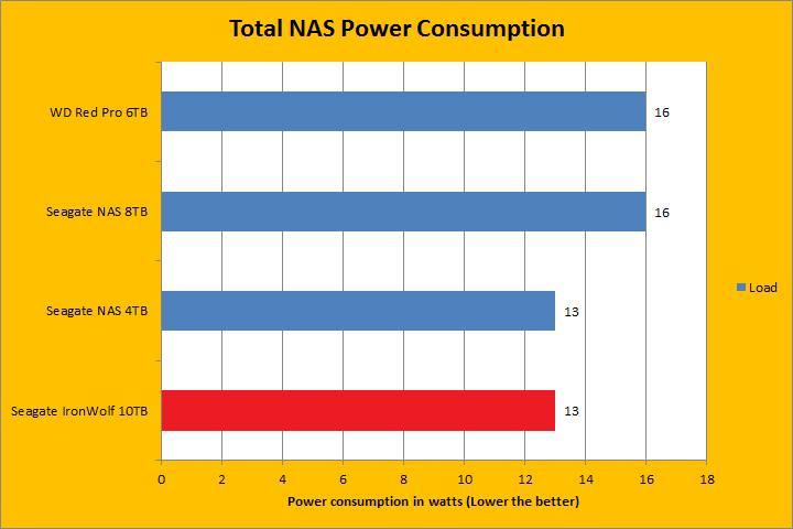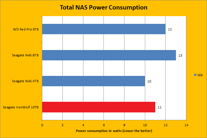 With one hard drive installed, our ASUSTOR AS3202T consumed the most power with Seagate's NAS HDD ST8000VN0002 8TB installed. Thanks to the helium fill as discussed on Page 2 of this review, the IronWolf ST10000VN0004 10TB is actually very efficient, especially considering its capacity. As most network attached storage systems will be running 24/7, and there will more than likely be multiple hard drives installed, every watt will definitely add up on your power bill. When idling, the entire system equipped with the 7,200RPM IronWolf 10TB took only 11W; one more than the 5,900RPM NAS HDD 4TB. This is a whopping 2W difference for just one drive alone compared to the 8TB NAS HDD. The gap continues to widen in our load tests. The system equipped with the Seagate IronWolf 10TB was excellent, considering its speed and capacity. At 13W, it was exactly the same as the slower 5,900RPM Seagate NAS HDD 4TB, which was considerably lower than the Western Digital Red Pro 6TB and Seagate NAS HDD 8TB.