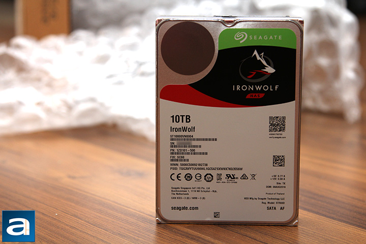 As always, with our storage reviews, before we move on to the benchmark results, let us briefly discuss the physical attributes of this hard disk drive first. The IronWolf ST10000VN0004 10TB is your quintessential 3.5" hard drive from Seagate; the top of the drive is bare metal with a dull silver finish, and a large label placed across the middle. That said, the label has been updated to reflect Seagate's new product branding, and the addition of color graphics make everything all the better. It is also nice to see the return of unique names, including IronWolf for NAS HDDs, FireCuda for SSHDs, BarraCuda for desktop HDDs, and SkyHawk for surveillance applications. The IronWolf we are reviewing today weighs in at 650g each, or about 1.43lbs. This is quite a bit lighter than the ST8000VN0002 8TB, thanks to the use of thinner platters. On the label, you will spot information like its 10TB drive capacity, model name, serial number, model number, part number, firmware revision, manufacturing date, bunch of regulatory logos, and that it is a product of Thailand. The Seagate IronWolf series come with a three year limited warranty.