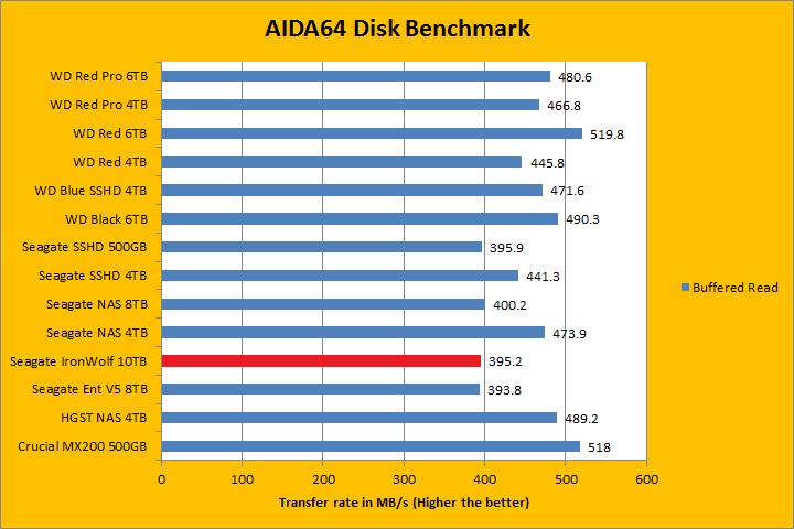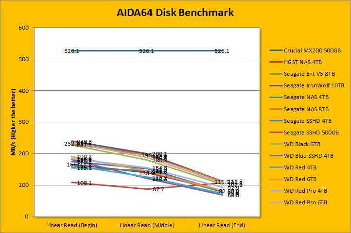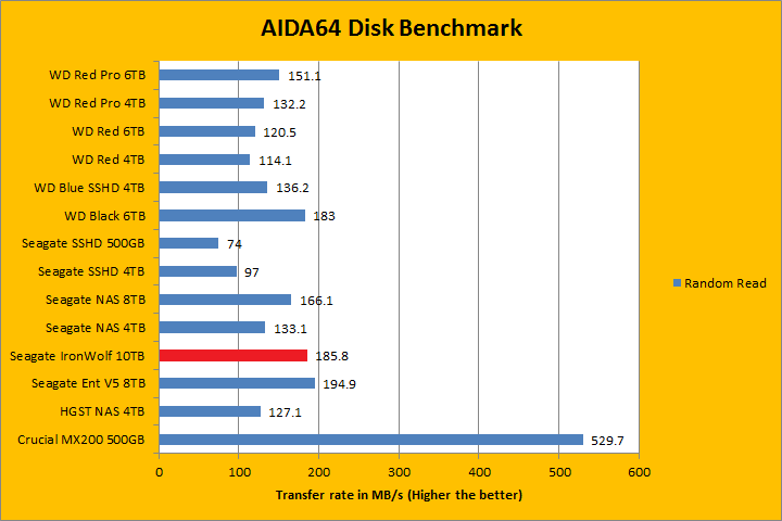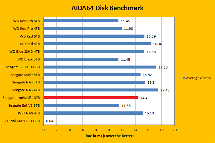 Since our storage review benchmark results are presented in alphabetical order, first up on the list are results from one of our favorite benchmarking programs, AIDA64 Engineer. Just to note, AIDA64 Engineer is a full synthetic benchmark. Unlike full synthetic motor oil, this usually does not always carry a good connotation. While it is not a representation of real life performance (Such as how fast you can copy movies to your drive), it does provide valuable insight into performance variation between drives from different manufacturers. As you can see in our graphs above, the latest 7,200 RPM Seagate IronWolf ST10000VN0004 10TB delivered top notch performance in the linear read segment; posting some of the fastest rates on the board. It clocked in at 239.3MB/s in the beginning of the drive, 200.1MB/s in the middle, and finishing with 111.0MB/s in the end. This was marginally faster than the Seagate Enterprise Capacity 3.5 HDD V.5 ST8000NM0055 8TB as well as the NAS HDD 8TB. The WD Black 6TB reported 227.3MB/s, 180.1MB/s, and 102.1MB/s, in that order. This means the IronWolf 10TB was faster than the Black 6TB, which makes sense, considering the Seagate we are testing today has much higher areal density. Its 14.4ms random access time was an improvement over the NAS HDD 8TB, but still no match for WD Black's 11.45ms and Enterprise Capacity 3.5 HDD V.5's 11.58ms.