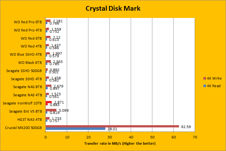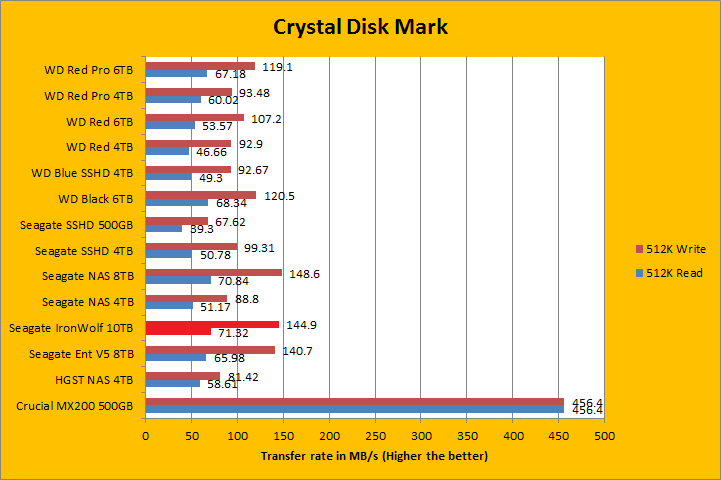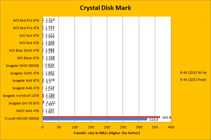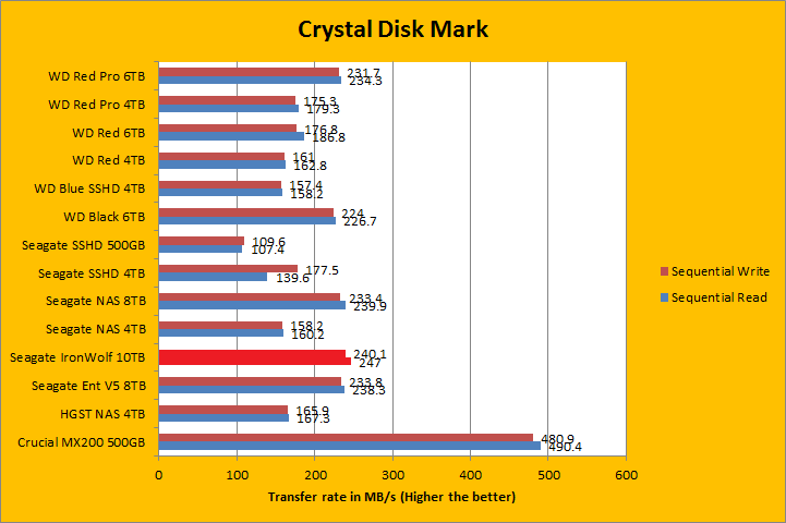 Crystal Disk Mark 3.0 is in the spotlight. Crystal Disk Mark is an important benchmark, because it tests the input/output operations per second capability of the storage device. As you can see in our charts above, compared against a few select drives; namely, hard drives from HGST, Seagate, and Western Digital, along with a mainstream MX200 500GB SSD from Crucial, the 7,200RPM Seagate IronWolf 10TB performed exceptionally well. It was obviously no contest against the Crucial SSD, but neither is the SSD's capacity against this 10TB monster. For a drive of this caliber, these results were excellent, as it really shone against the near-enterprise grade Western Digital drives. Like all HDDs in the presence of an SSD, it was blown away in the 4K and 4K QD32 results. Its 4K and 4K QD32 write performance was obviously no match against the workload optimized Enterprise Capacity 3.5 HDD V.5 either other than 4K QD32 read, but the IronWolf posted class leading results in these areas compared to other mechanical disks, often by a significant margin. Generally speaking, the Seagate IronWolf ST10000VN0004 10TB was near the top, if not at the top, in most of the tests. I will let you take a look at the results in our comparison graphs above.
