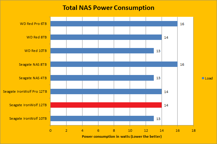 With one hard drive installed, our ASUSTOR AS3202T consumed a moderate amount of power with one Seagate IronWolf ST12000VN0007 12TB hard drive. Thanks to the helium fill as discussed in Page 2 of this review, the ST12000VN0007 12TB was very efficient, especially considering its capacity. As most network attached storage systems will be running 24/7, and there will more than likely be multiple hard drives installed, every watt will definitely add up on your power bill. When idling, the entire system equipped with the 7,200RPM IronWolf 12TB took only 11W; one more than the 5,900RPM NAS HDD 4TB and the same as the helium filled IronWolf 10TB. This is a whopping 2W difference for just one drive alone compared to the 8TB NAS HDD. The gap continued into our load tests. The system equipped with the Seagate IronWolf 12TB came in at 14W; just one more watt than the 5,400RPM Western Digital Red 10TB and Seagate IronWolf 10TB.