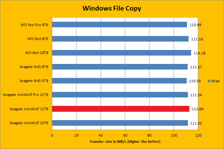 ATTO disk benchmark provides valuable insight into evaluating disk performance; it is especially valuable since it is not local disk limited like Windows file copy -- but rather the network adapter itself. After first using it in our QNAP TS-559 Pro+ review back in 2010, ATTO has been an integral part of our storage benchmarks; used in everything ranging from USB flash drives to solid state disks. Venturing in the area of 118MB/s in read and write for pretty much everything 32K and up, remember that the theoretical maximum of Gigabit Ethernet is 'only' 125MB/s (1000Mbps / 8) with overhead -- this is about as good as it gets. The IronWolf 12TB's ramp up profile was slightly slower than the IronWolf Pro 12TB in both read and write.